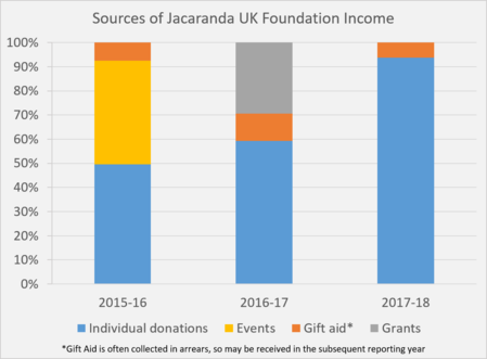 The majority of our income thus far has come from individual donations, and the resulting gift aid. These are a mixture of regular donors and those who raise money by taking part in events (such as The Vitality Big Half, or the London Marathon) and get sponsored for us. We are extremely grateful to all our individual donors, you allow us to plan for the future safe in the knowledge that regular donations will be coming in. We hope to continue to increase the number of regular donations moving forwards, and are always looking for people who want to do sponsored events for us.